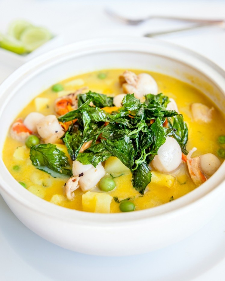 Fotografia de uma tigela com sopa de frutos do mar.